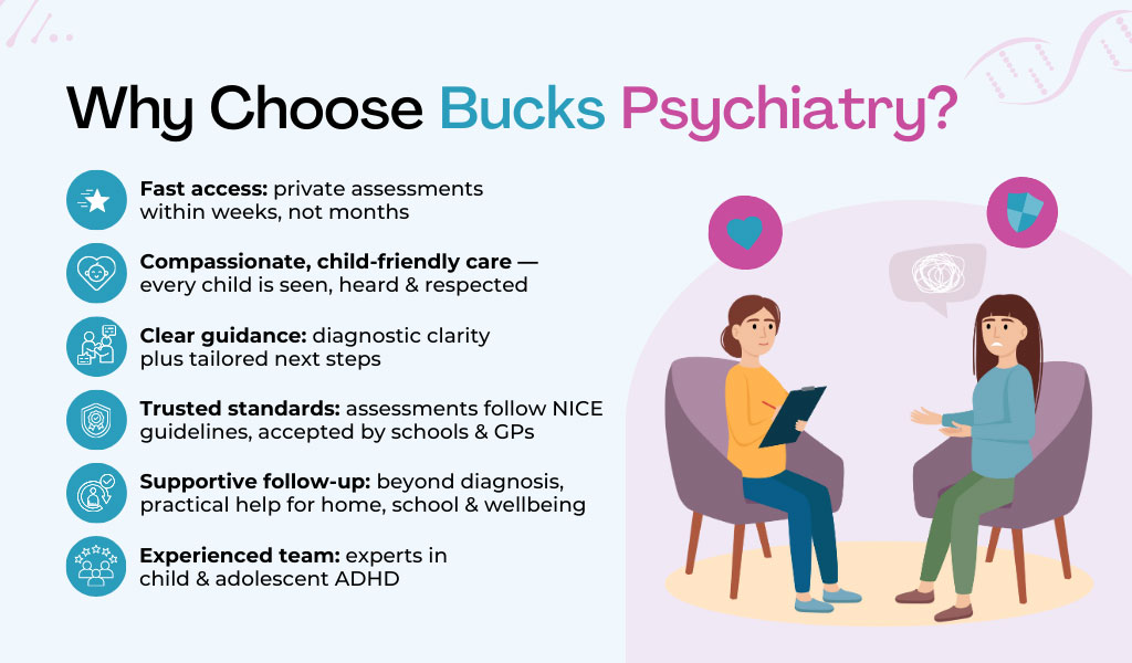 The dedicated and highly experienced team at Bucks Psychiatry understands that getting the right diagnosis can transform your child or teen’s school experience, confidence, and family life. Our aim is to work together with you to give them the understanding and support they deserve.