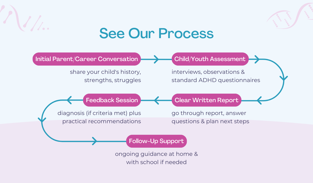 A professional ADHD assessment is the first step towards understanding your child’s needs. It opens the door to school support, practical strategies at home, and if appropriate, treatment options such as behavioural approaches or medication.